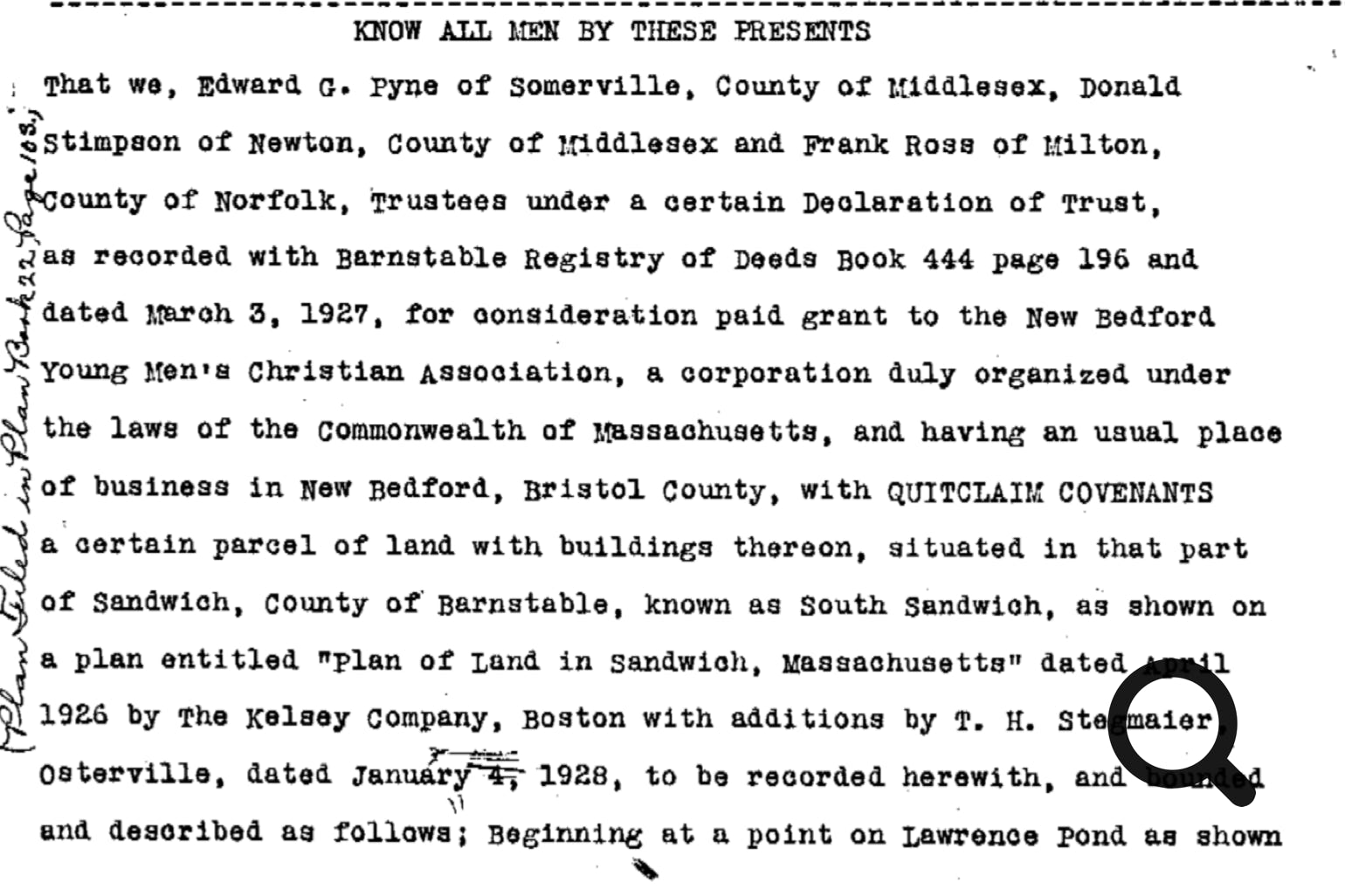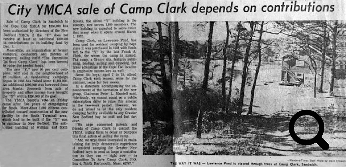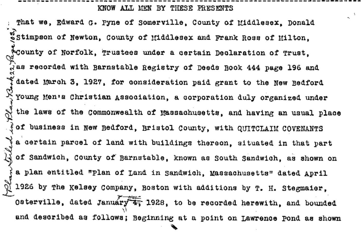 In 1928, these investors called Central Cape Realty Corporation sold a 79 acre parcel of former farm and pasture land on the banks of Lawrence Pond to the New Bedford YMCA. Later that year, Camp Clark opened.