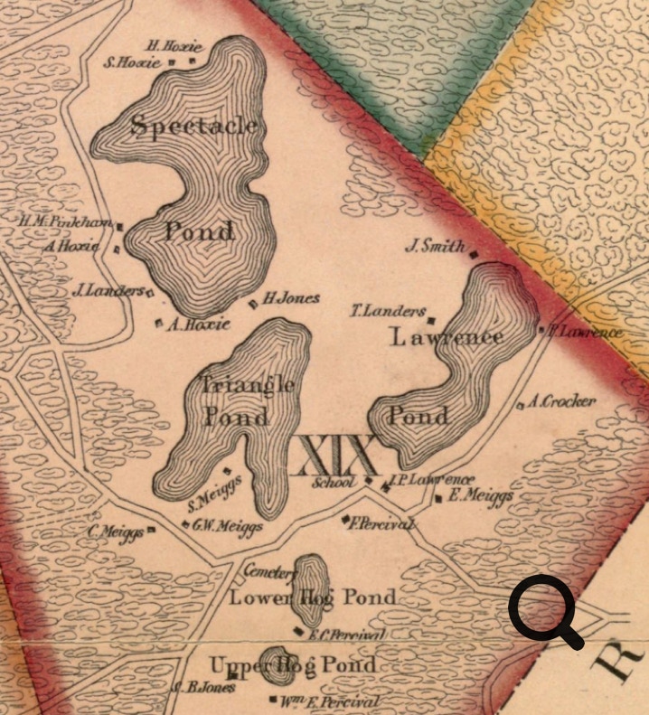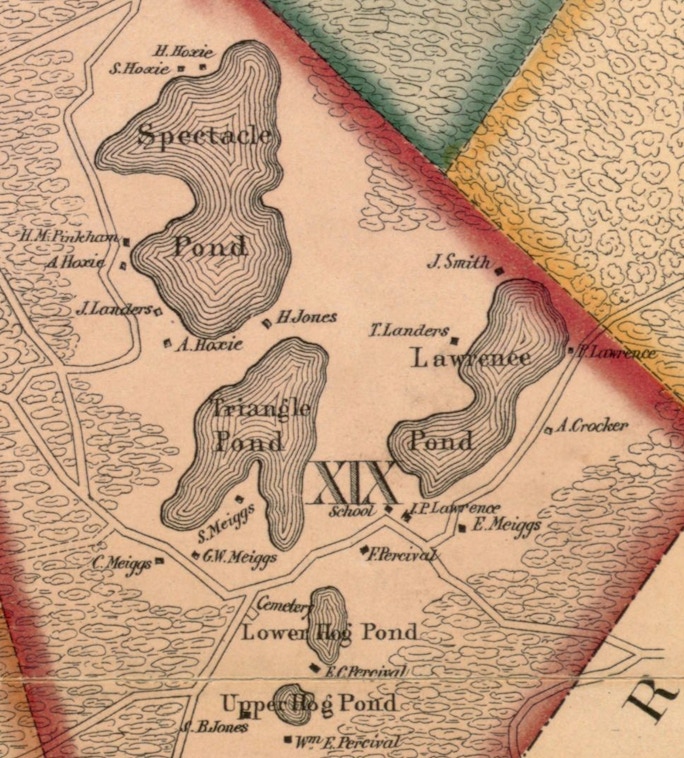 In 1682, the Plymouth Colony issued a notice to towns that all communal land must be divided among the inhabitants. The town had other priorities, so it wasn’t until 1698 that the process of splitting 20,000 acres of forest and field. By 1715, lots of 40 acres were surveyed and distributed to families, with the Percival, Meiggs, Jones, Lawrence, and Hoxie families the first to settle around Lawrence Pond. The map to the left, from 1857, shows many of these families were still holding property in the area.