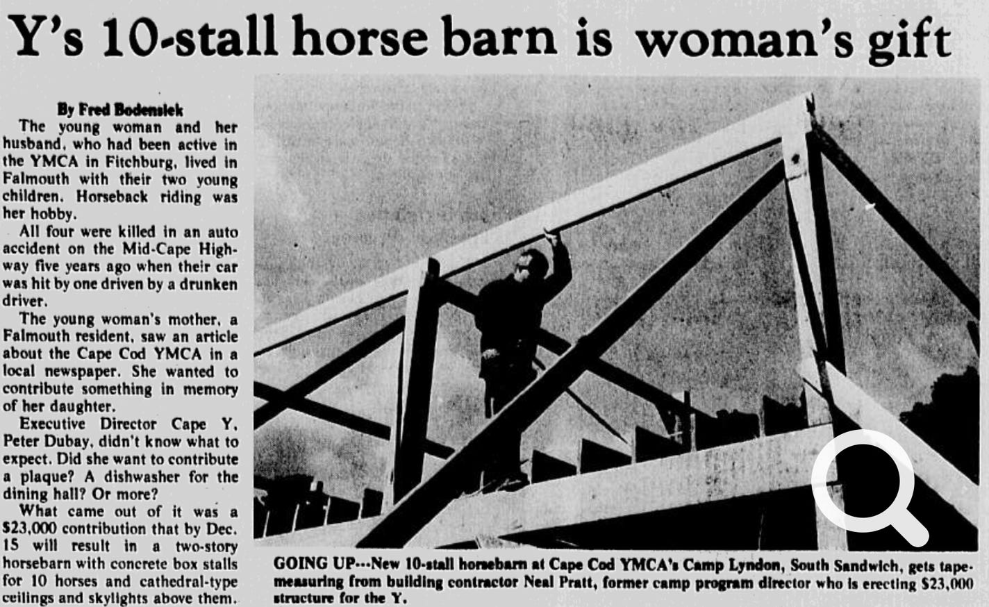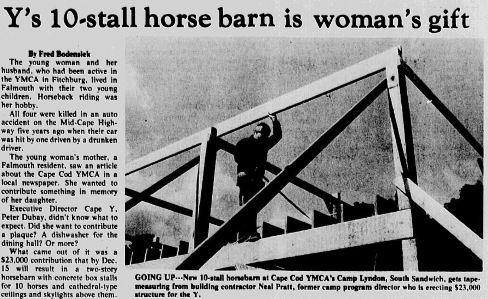 Camp Lyndon has offered horseback riding since at least 1975, but in 1983 Liz’s Stables were built in memory of a Falmouth family, the Mellens, killed in a car crash. Peter Dubey, Neal Pratt, and Camp Director Joe Leary oversaw the construction of the new structure, which replaced a facility that was built out of pallets.
