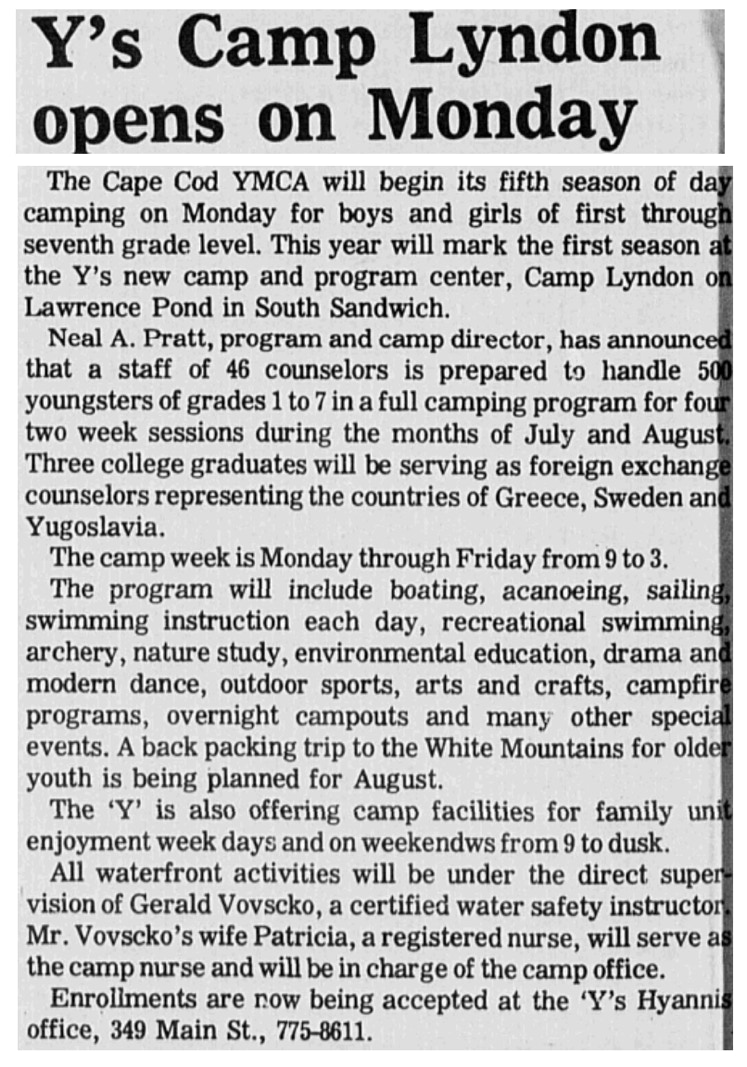 In 1971, Lyndon Lorusso died in an accident at the age of 17, devastating his parents. Upon returning from a trip to Europe to process his loss, Paul and Lila decided to devote their lives to helping the Cape Cod community, in memory of their son. Their first act was to offer up the money to purchase Camp Clark, $250,000 in all (after inflation, $1.8m in 2022). The New Bedford YMCA voted to accept this bid, and in 1972, Camp Lyndon opened its doors.