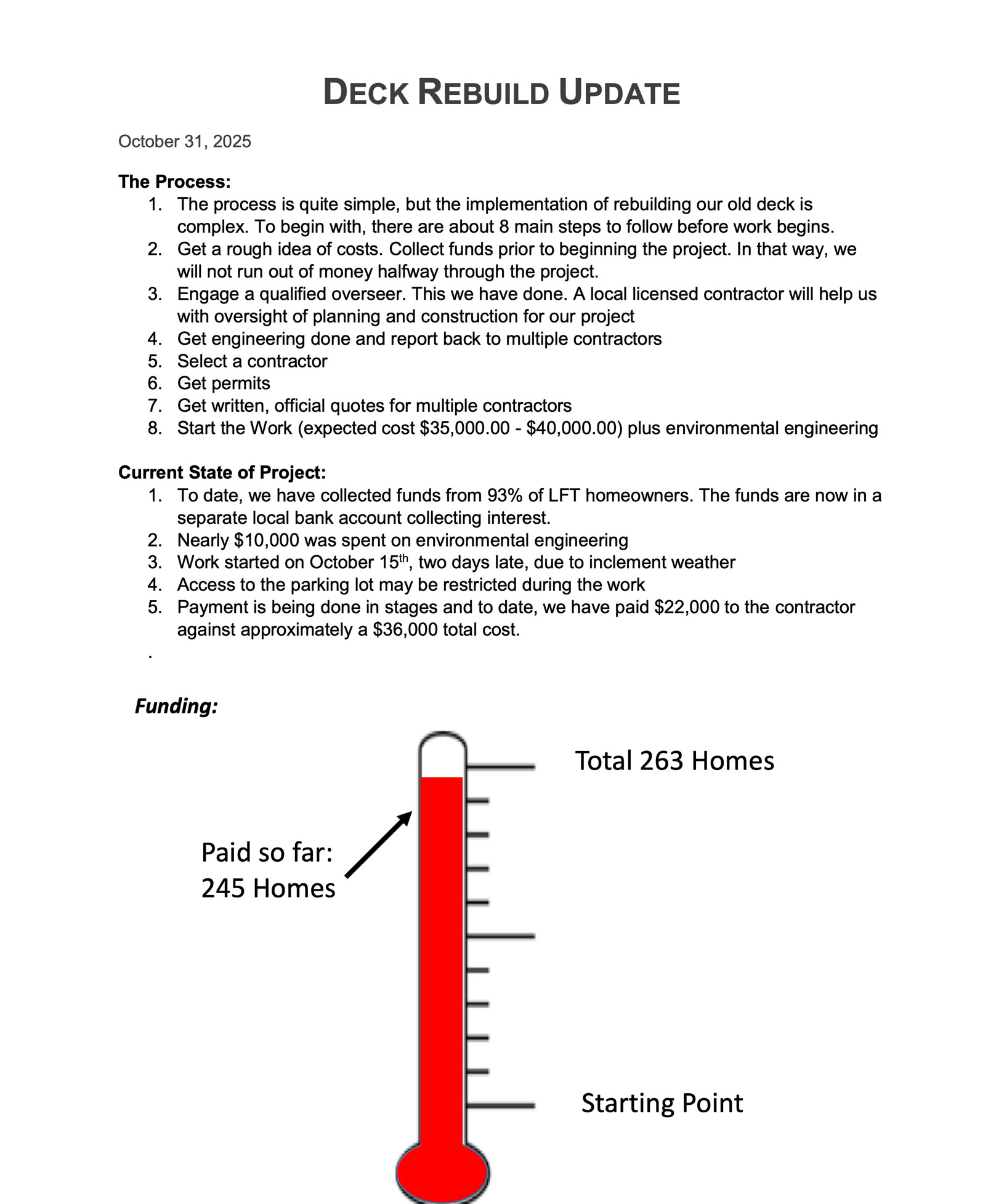 Learn about the $200 special assessment you must pay to replace our aging deck on our BUDGET PAGE. This page is password-protected. To get the login info required, please email us.